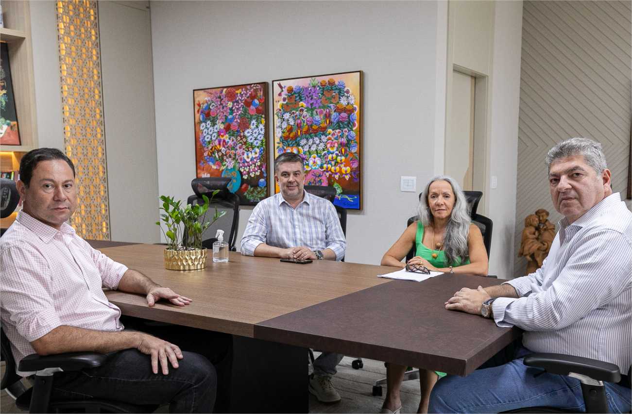A imagem mostra quatro pessoas durante uma reunião, sendo duas delas servidores da saúde, a secretária de Saúde do município e o conselheiro Guilherme Malu, em um encontro que acontece no gabinete do conselheiro no Tribunal de Contas de Mato Grosso (TCE-MT). Todos estão em volta de uma mesa, posando para a foto. Ao fundo, há dois quadros bastante coloridos que se destacam em contraste com as paredes de tons claros.