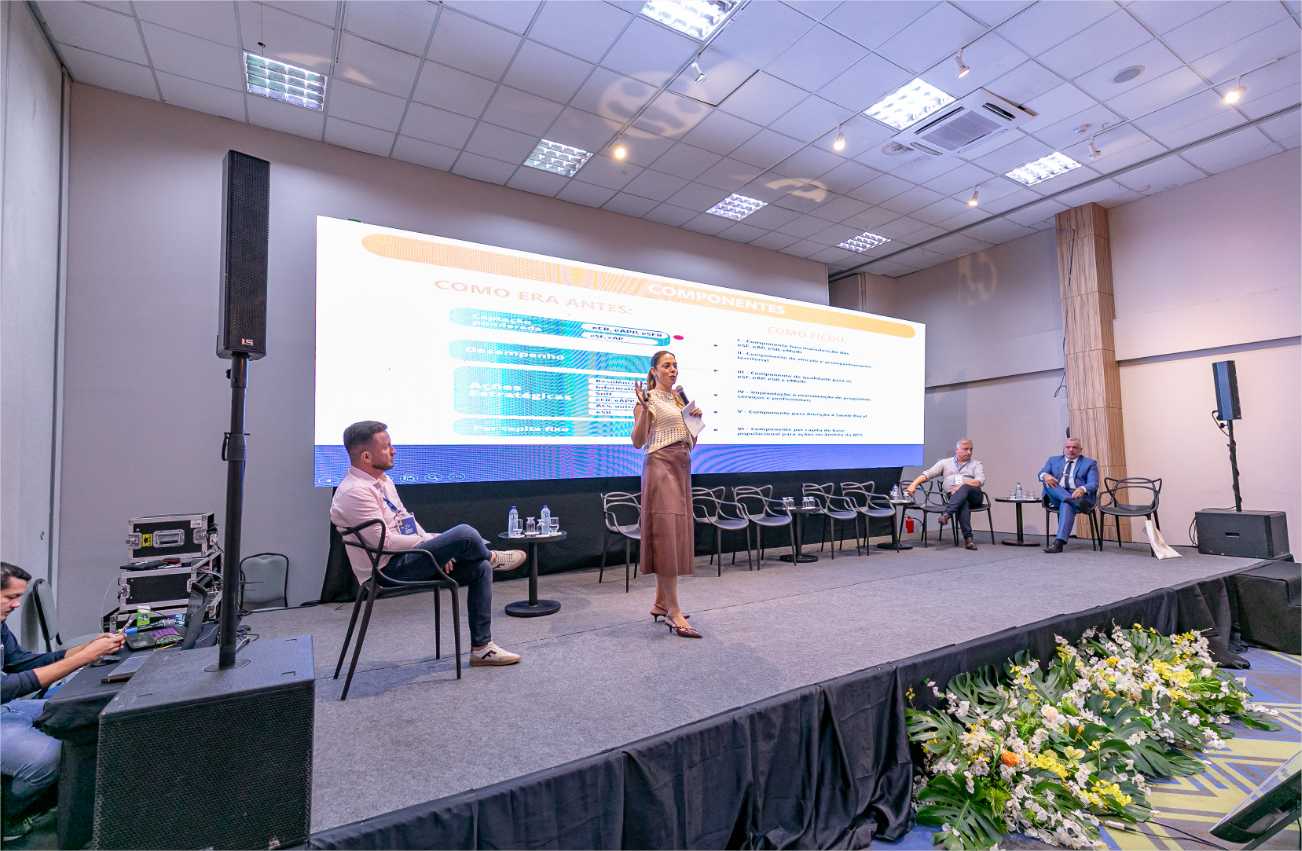 A imagem mostra palestrantes durante a apresentação do evento que acontece no auditório de um hotel. Uma mulher está centralizada no palco, discursando, enquanto outras pessoas sentadas a observam. Ao fundo, há um telão que transmite os slides da apresentação.