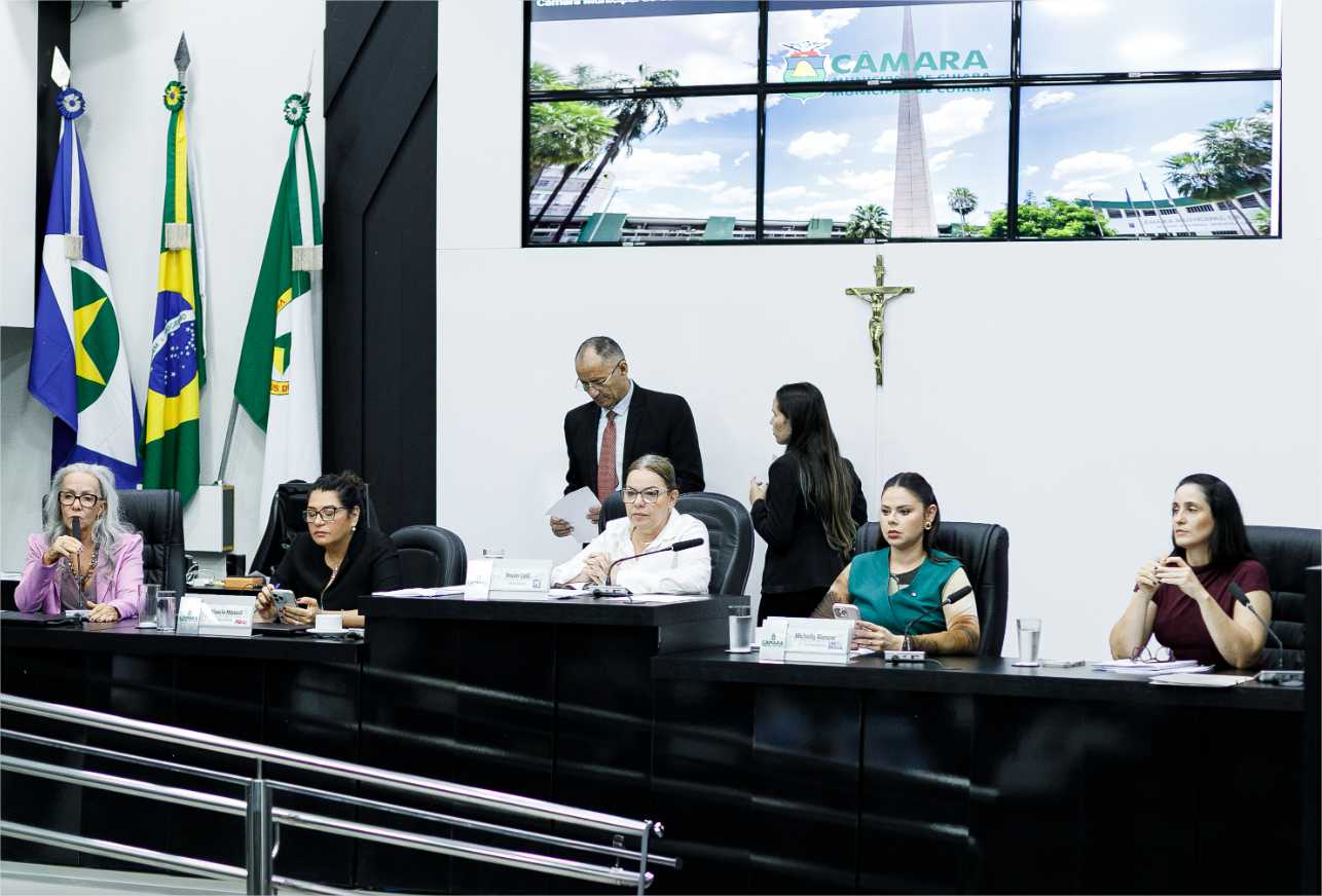 A secretária municipal de Saúde, Dra. Lúcia Helena Sampaio, acompanhada da diretora da Empresa Cuiabana de Saúde Pública (ECSP), Thania Zanette, esteve nesta quinta-feira (26) na Câmara Municipal de Cuiabá para prestar esclarecimentos sobre a gestão da pasta e a rotina da saúde pública municipal. Assuntos como a retomada dos serviços de raio‑x em todas as Unidades de Pronto Atendimento (UPAs) e a compra de medicamentos foram destaques na sessão.