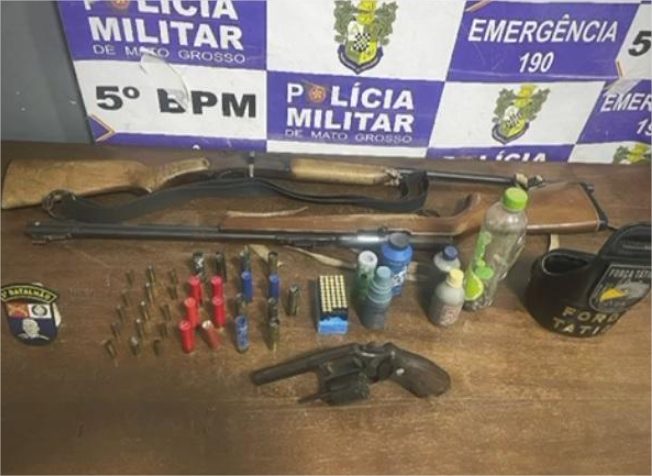 Com o suspeito, foram apreendidos um revólver, duas espingardas e munições de diversos calibres, além de uma garrafa com 83 balotes de chumbo para recarga de munição para espingarda.
