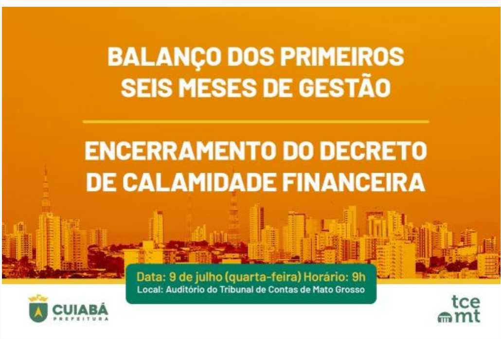 O Tribunal de Contas de Mato Grosso (TCE-MT) recebe, na quarta-feira (9), o balanço dos seis primeiros meses da atual gestão da Prefeitura de Cuiabá. A apresentação dos dados, referentes ao Decreto de Calamidade Financeira, será realizada no auditório da Escola Superior de Contas a partir das 9h, com a presença de autoridades estaduais e municipais.