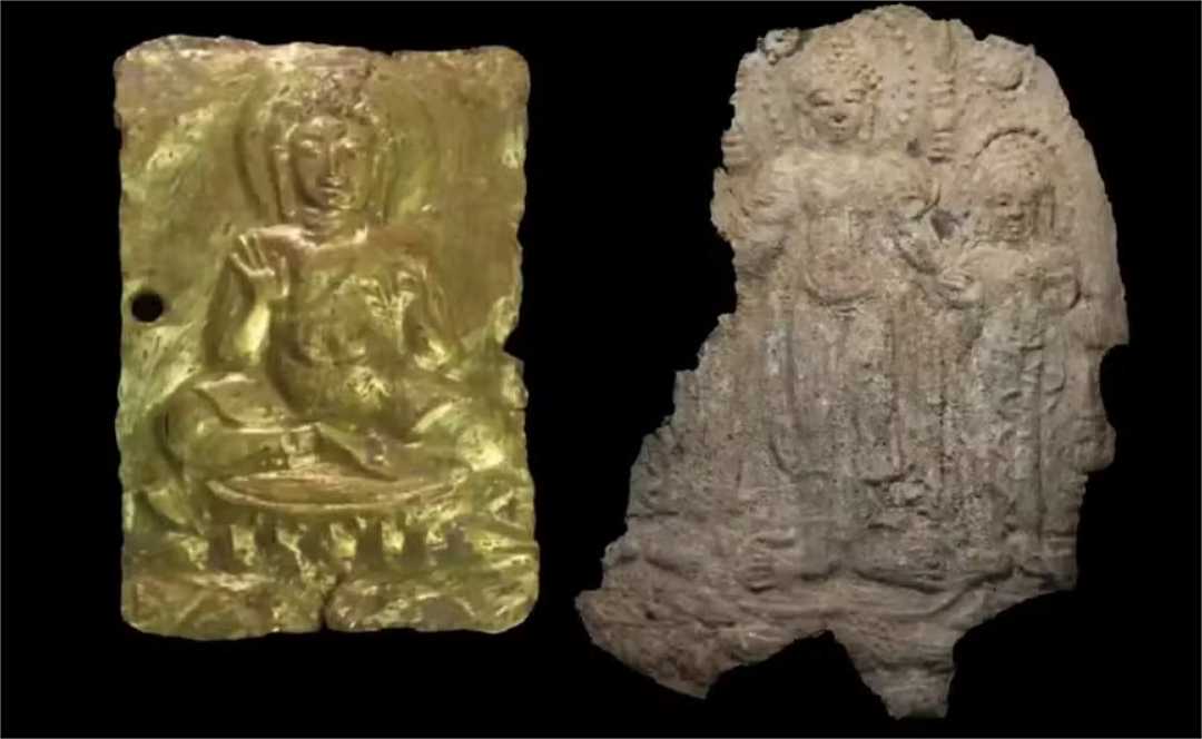 Além de contém também peças de caráter religioso, em destaque uma placa ornamentada em liga de chumbo e estanho (conhecida localmente como “chin”), medindo 8 cm x 12,5 cm, que representa um Buda sentado em posição de lótus executando o Vitarka Mudra, o gesto característico da transmissão de ensinamentos. Igualmente relevante é um relevo danificado que mostra um Buda em pé vestindo túnica esvoaçante, ladeado por duas figuras secundárias, sendo uma delas possivelmente Phra Phrom, a versão tailandesa do deus hindu Brahma, testemunhando o diálogo entre tradições religiosas no sudeste asiático medieval.