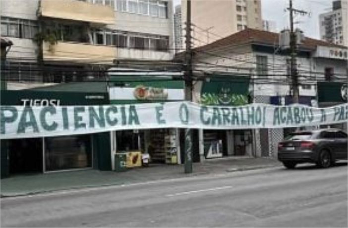 Torcedores do Palmeiras colocaram uma faixa, neste sábado (9), nos arredores do Allianz Parque, como uma forma de protestar pela fase do time. O “recado”, em verde, dizia: “paciência é o c***… Acabou a paz”. Vale lembrar que o Verdão não vence há três jogos (derrotas e eliminação para o Corinthians e empate com o Vitória).