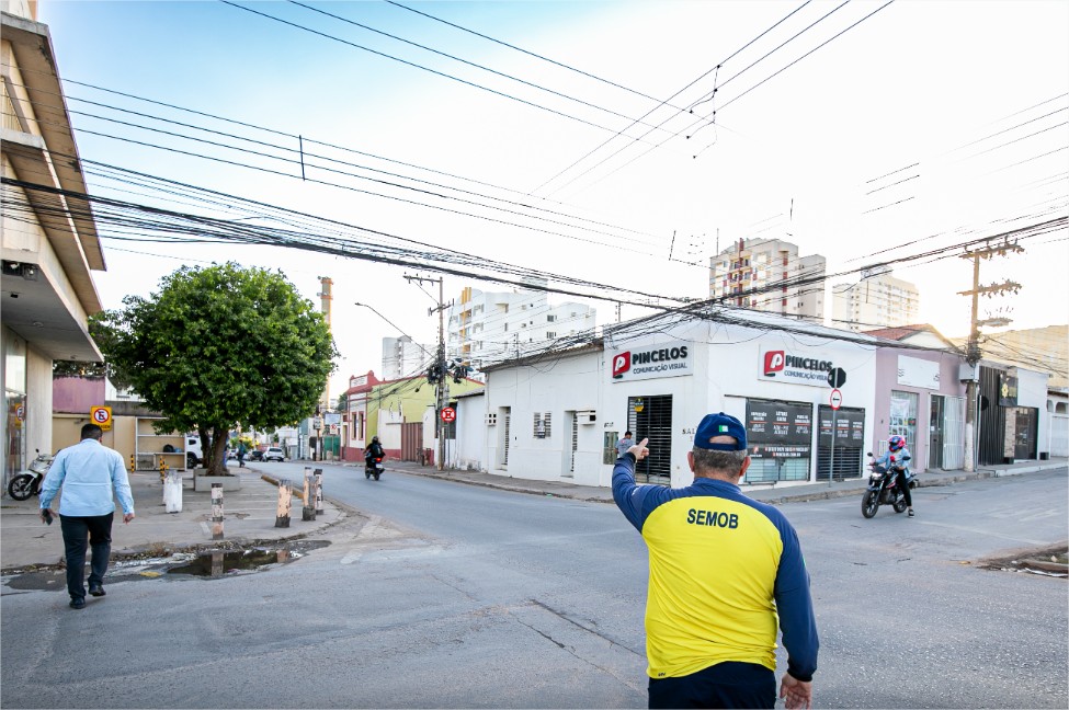 A foto mostra o ponto inicial da interdição, no cruzamento da Rua Thogo Pereira. O supervisor da Semob está posicionado no local explicando a ação.